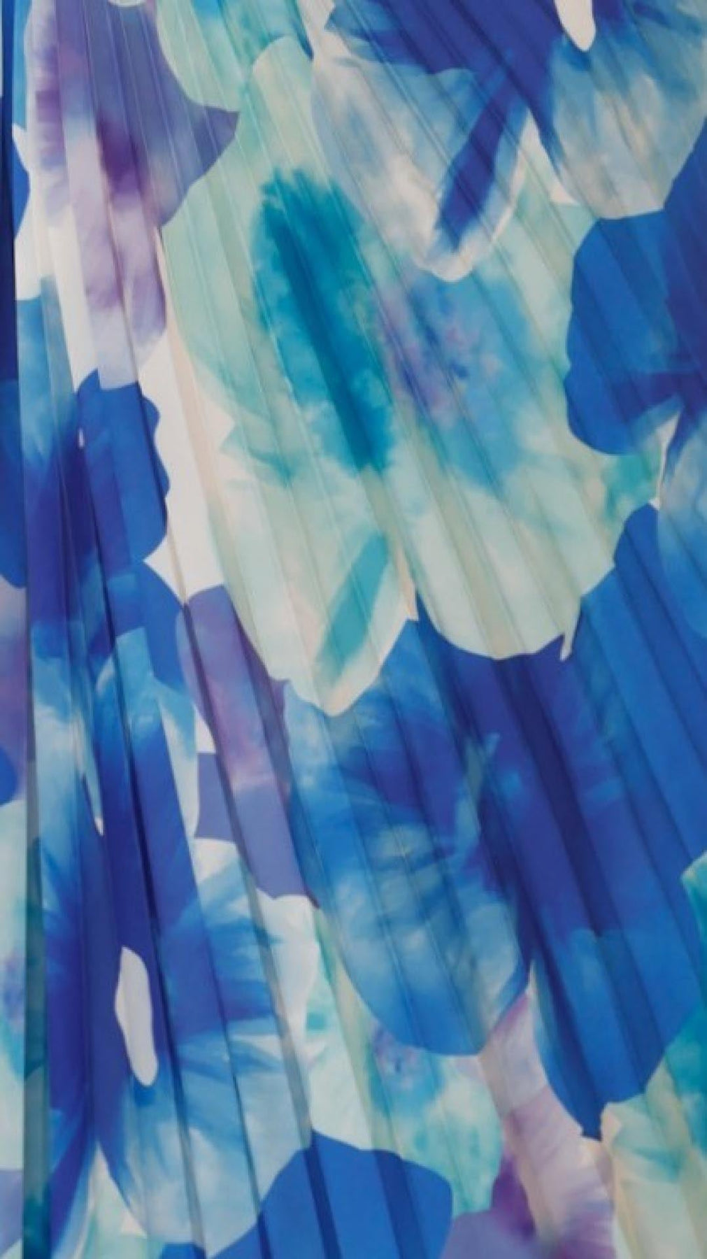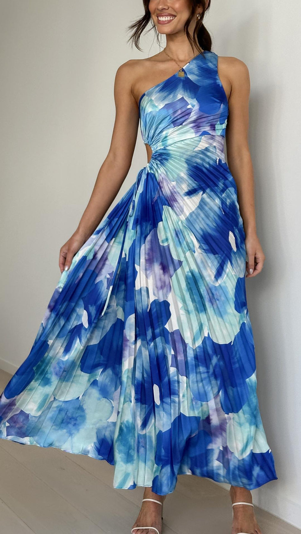 Abbraccia l’eleganza con questo abito lungo monospalla blu con stampa floreale. Caratterizzato da dettagli plissettati, un taglio laterale regolabile e una zip invisibile sul fianco, è la scelta perfetta per ogni occasione.